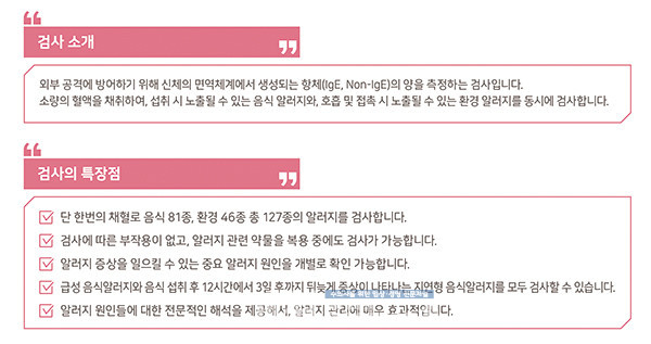 또한 검사에 따른 부작용이 없고, 알러지 관련 약물을 복용 중에도 검사가 가능하며, 알러지 증상을 일으킬 수 있는 중요 알러지 원인을 개별로 확인할 수 있다.