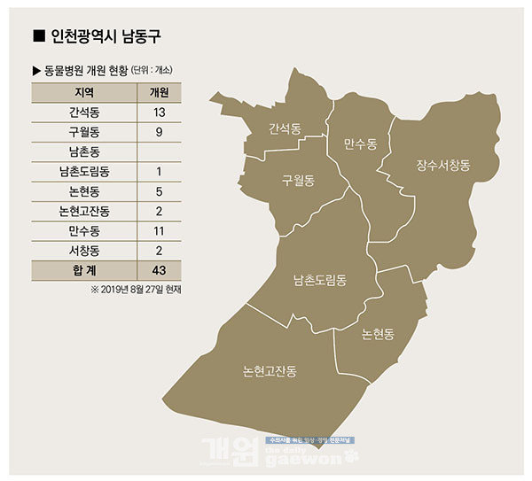 2019년 8월 27일 현재 남동구에는 43개의 동물병원이 개원하고 있다.
