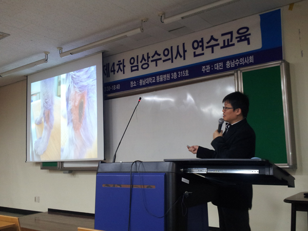 정성목(충남대 수의과대학 수의외과학) 교수의 사회로 진행된 이날 연수교육에서는 박성준(충남대 수의과대학 수의임상병리학) 교수가 ‘SKINNOTE; pododermatitis(비슷한 소견을 보이나 다른 질환들)’를 주제로 로컬 동물병원에서 흔하게 접하는 피부질환의 진단과 치료법을 제시해 주목을 받았다.