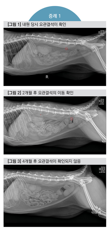 이후 경련 증상의 악화 및 비장 종양 발생으로 사망하였으나 요관결석과 관련 의심되는 유의적인 질소혈증의 재발은 확인되지 않았습니다. <다음호에 계속>