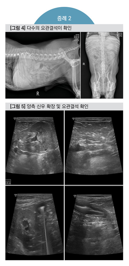 영상검사 상 양측 요관결석 음영과 중등도로 확장된 요관 및 우측 신우 확장이 확인 되었습니다. 췌장 주변부 지방의 에코 증가가 확인되어 췌장염 가능성 고려하며, 수액처치 및 Mannitol 0.25 g/kg SID, Tamsulosin 0.005 mg/kg BID 투여 후 3일째 요관결석은 동일하게 관찰 되었으나 질소혈증은 개선 되었으며, 임상증상은 더 이상 보이지 않아 보호자의 요청으로 Tamsulosin 0.005mg/kg BID 처방 후 퇴원 조치 하였습니다.
