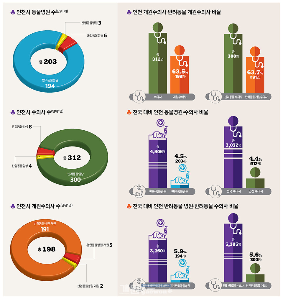 인천 수의사 중 개원수의사 비율을 살펴보면 총 312명 중 63.5%(198명)를 차지했으며, 반려동물 수의사 총 300명 중 반려동물병원 개원수의사 비율은 63.7%(191명)로 나타났다.