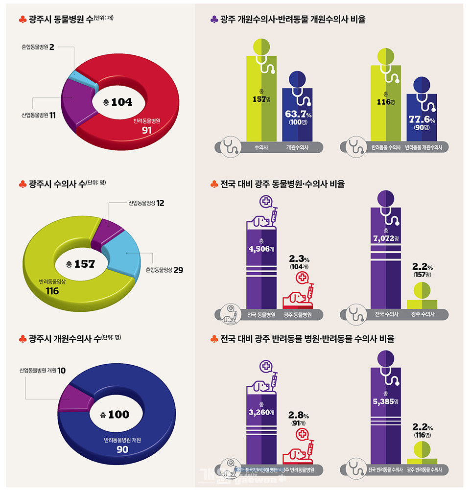 반려동물 병원은 전국 총 3,260개 중 광주시에 2.8%(91개)가 분포돼 있으며, 전국 반려동물 수의사는 총 5,385명 중 2.2%(116명)가 광주시에 근무하는 것으로 조사됐다. <편집자주>