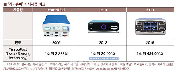 ‘리가슈어’는 저항 값으로 콜라겐 변형을 일으켜 혈관 결찰을 통해 주변 조직의 손상이 적고, 실링 후 커팅에 대해 선택할 수 있는 장점이 있다.