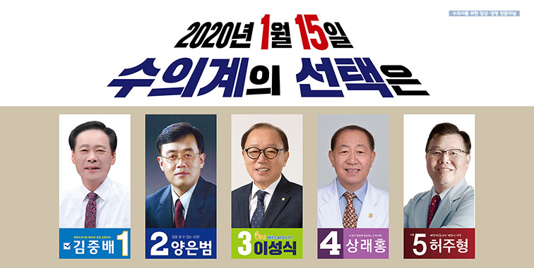 기호 1번은 김중배 전남수의사회장, 기호 2번 양은범 제주도수의사회장, 기호 3번 이성식 경기도수의사회장, 기호 4번 상래홍(안암동물병원) 전 서울시수의사회장, 기호 5번 허주형(동물병원K) 한국동물병원협회장이다.