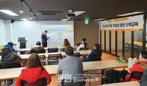 교육은 반려견 행동교정 전문가 김평호 소장이 반려견 성향에 맞는 목줄 선택부터 집안에서 실외까지 순차적으로 산책 범위를 넓혀가는 산책 방법에 대해 강연했다.