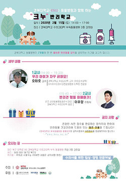 올해 2월 처음 진행되는 ‘크누(KNU) 반려학교’에서는 오태호 교수가 ‘우리 아이가 자꾸 긁어요!’, 이우장 수의사가 ‘반려견 행동 이해하기!’를 주제로 경북대 부속동물병원 2층 강의실에서 오후 2시부터 5시까지 진행한다.