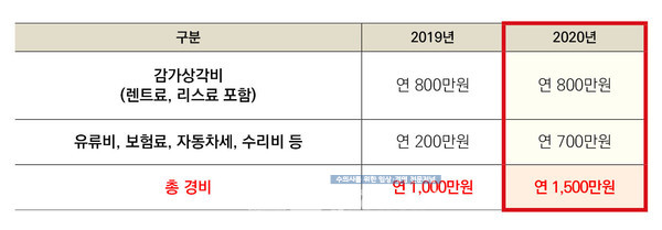 여기서 감가상각비는 승용차에 대해 매년 자산의 가치가 감소하는 것을 뜻하며, 감소된 만큼 경비로 전환이 된다. 나머지 렌트료, 리스료, 유류비 등은 승용차에 대해 계속적으로 발생하는 경비이다.