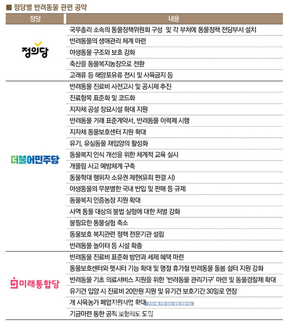 4.15 총선이 다가오면서 각 정당들이 동물복지 관련 공약을 발표했다. 반려인구가 증가하면서 매년 정치인들의 반려동물 관련 공약이 쏟아지고 있지만 이번 공약은 정당에서 조직적으로 내놓았다는 점에서 차별이 있다.