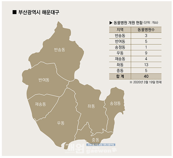 해운대구는 신도시 개발로 꾸준히 중산층의 유입이 이루어진 지역답게 많은 동물병원이 개원하고 있다.