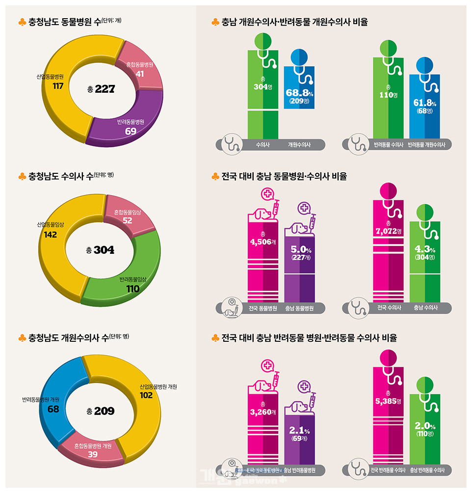 전국 대비 충남에 개원한 동물병원 비율은 전국 총 4,506개 병원 중 5.0%(227개), 수의사는 총 7,072명 중 4.3%(304명)가 충남에 분포돼 있으며, 반려동물병원은 전국 총 3,260개 중 충남에 2.1%(69개), 반려동물 수의사는 총 5,385명 중 2.0%(110명)가 충남에 근무하는 것으로 조사됐다.