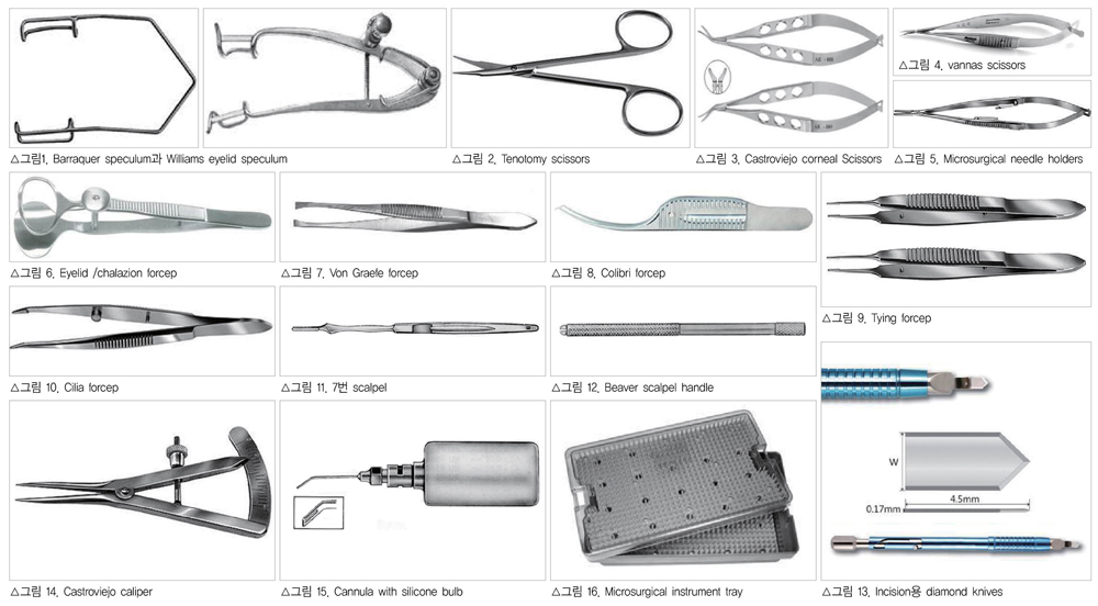 가장 기본적인 기구는 결막에 대한 절제나 조직의 둔성분리 등을 담당할 수 있는 Tenotomy scissors와 각막에 대한 역할을 하는 Corneal scissors, 그리고 Iris scissors 가 자주 사용되고 있다.