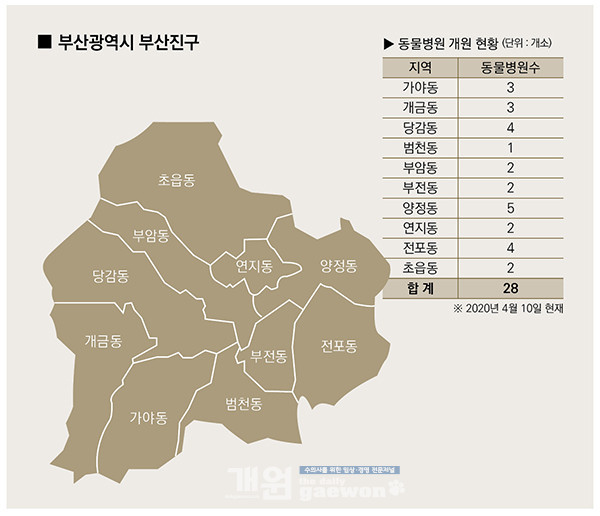 2020년 4월 10일 현재 부산진구에는 28개의 동물병원이 개원, 양정동(5개소), 전포동(4개소), 당감동(4개소) 순으로 비교적 지역별로 고르게 개원하고 있다.