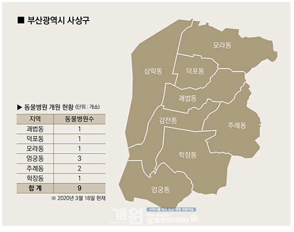 사상구는 인구도 매년 감소하면서 동물병원도 개원보다 폐업이 많은 지역 중 하나다. 올해 3월 18일 현재 사상구의 동물병원은 총 9개소에 불과하다. 대부분의 지역에 동물병원 1개소만 개원하고 있는 상태다.