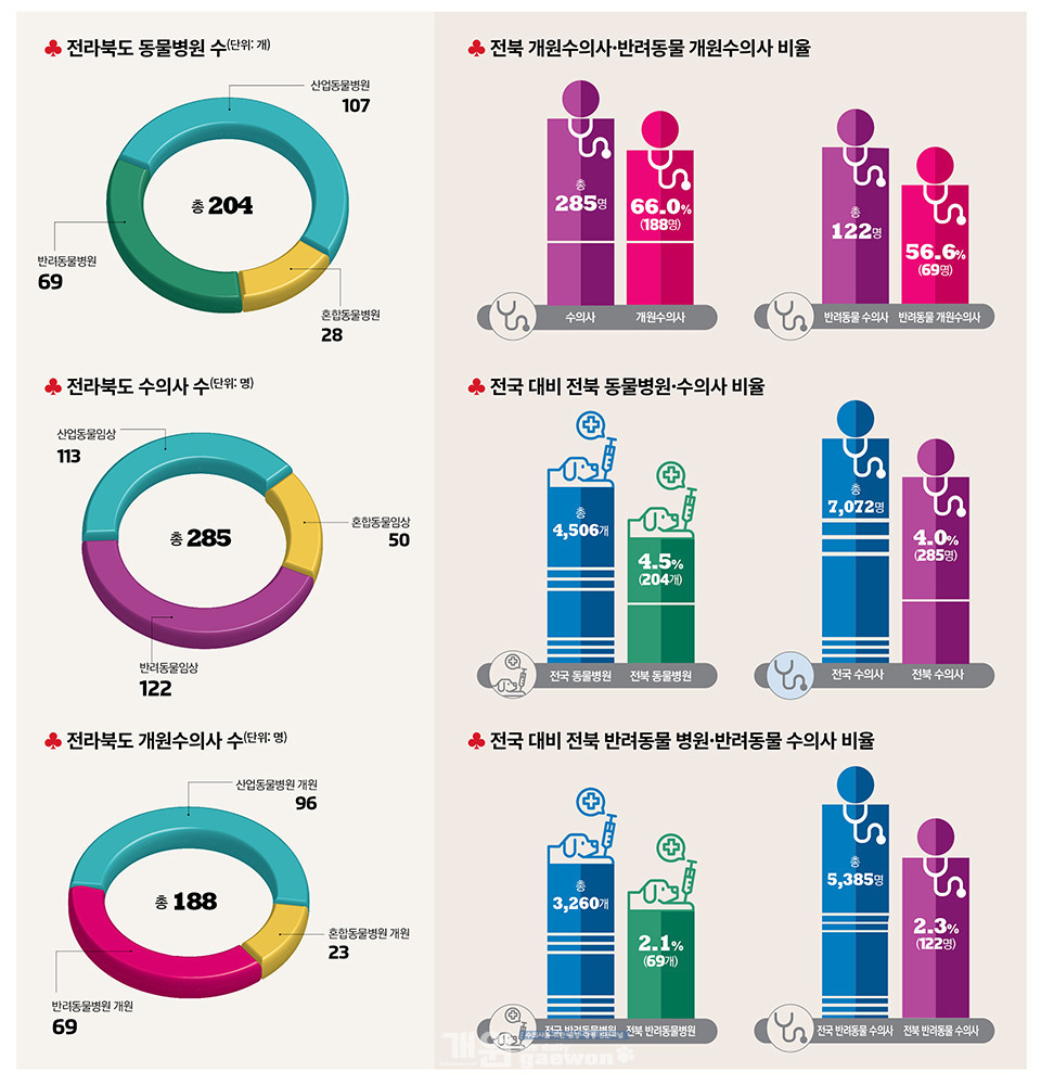 전국 대비 전북에 개원한 동물병원 비율은 전국 총 4,506개 병원 중 4.5%(204개), 수의사는 총 7,072명 중 4.0%(285명)가 전북에 분포돼 있으며, 반려동물병원은 전국 총 3,260개 중 전북에 2.1%(69개), 반려동물 수의사는 총 5,385명 중 2.3%(122명)가 전북에 근무하는 것으로 조사됐다.