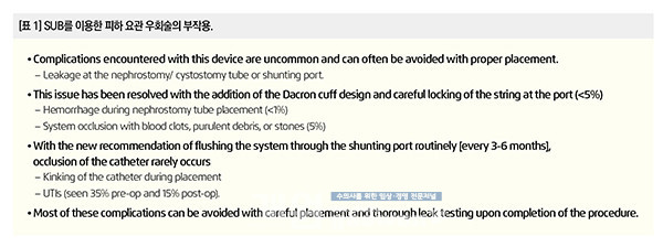 SUB는 요관의 손상 없이 신우에서 방광으로 요의 흐름을 가져갈 수 있게 하는 장점이 있습니다. 이러한 점은 다른 수술 보다 환자에게 안전한 수술 옵션을 줄 수 있습니다.