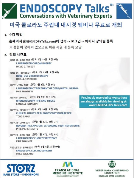 미국 콜로라도 주립대 내시경 웨비나(Endoscopy Talks-Conversations with Veterinary Experts)가 무료로 총 8회에 걸쳐 진행된다.