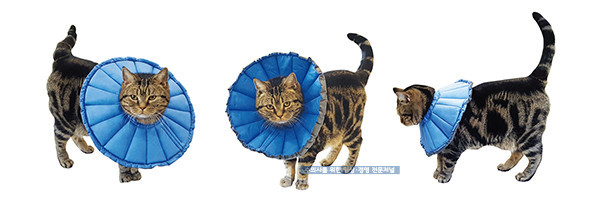 일반적인 치료 또는 중성화 수술 후에는 ‘편평형’으로, 눈, 귀, 얼굴 부위 치료했을 경우에는 ‘원추형’으로, 활동 제약을 최소화하고 싶을 때는 ‘역원추형’으로 변형해서 사용할 수 있어 동물병원과 보호자들로부터 큰 인기를 모으고 있다.