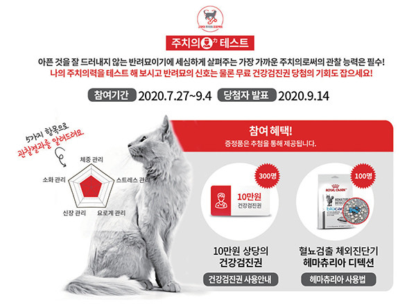 ‘고양이 주치의 프로젝트’ 온라인 페이지에서는 반려묘의 건강 신호를 체크해보고, 경품으로 ‘건강 검진권’을 받을 수 있는 이벤트를 9월 4일(금)까지 진행한다.
