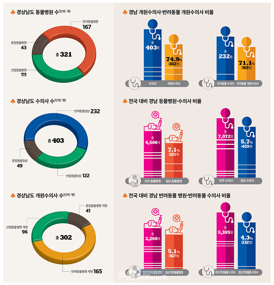 경남 수의사 중 개원수의사 비율을 살펴보면 총 403명 중 302명으로 74.9%를 차지했으며, 반려동물병원 개원수의사는 반려동물 수의사 232명 중 165명이 개원해 71.1%로 나타났다.