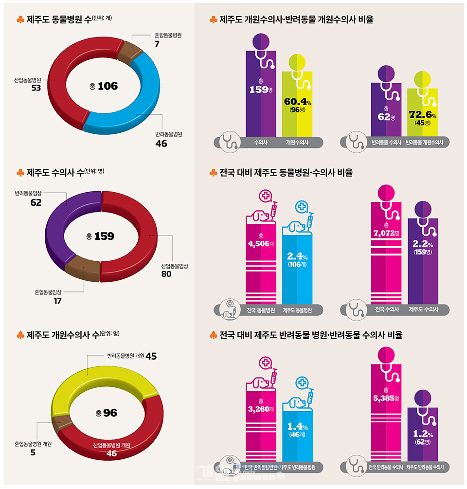 전국 대비 제주도에 개원한 동물병원 비율은 전국 총 4,506개 병원 중 2.4%(106개), 수의사는 총 7,072명 중 2.2%(159명)가 제주도에 분포돼 있으며, 반려동물병원은 전국 총 3,260개 중 제주도에 1.4%(46개), 반려동물 수의사는 총 5,385명 중 1.2%(62명)가 제주도에 근무하는 것으로 조사됐다.