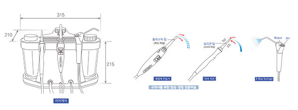 ‘3-Way syringe’는 치과 유니트에 부착돼 있는 제품과 동일한 제품으로 귀 치료가 끝난 후 에어를 이용해 귓바퀴를 정리해 줄 수 있다.