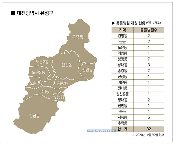 사람들이 몰리고 있는 지역인 만큼 유성구는 수의사들의 관심 개원지이기도 하다. 2017년 29개소였던 동물병원은 2020년 1월 30일 현재 32개소로 증가했다.