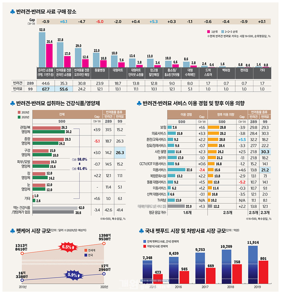 전년과 비교해 전문 온라인 쇼핑몰, 창고형 할인매장에서의 구매가 증가한 반면 동물병원에서의 구매는 감소한 것으로 나타났다.