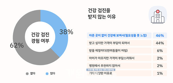 지난 8월 보호자를 대상으로 실시한 ‘반려동물 건강검진’ 설문 결과, 건강검진을 경험한 보호자는 38%에 그쳤고, 나머지 62% 중 절반에 가까운 46%가 ‘반려동물에게 건강검진을 해 줄 필요성을 느끼지 못한다’고 대답했다. 이어 44%가 ‘가격부담으로 건강검진을 받지 못한다’고 답변했다.