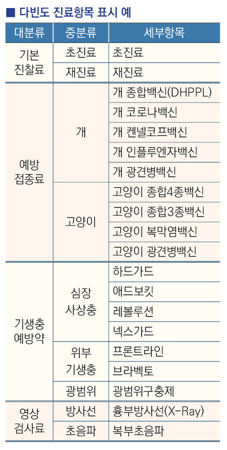 각 항목에 대한 진료비는 각 병원마다 진료서비스의 수준 등을 고려해 개별 동물병원이 정한 후 병원 내부에 게시하도록 했다.