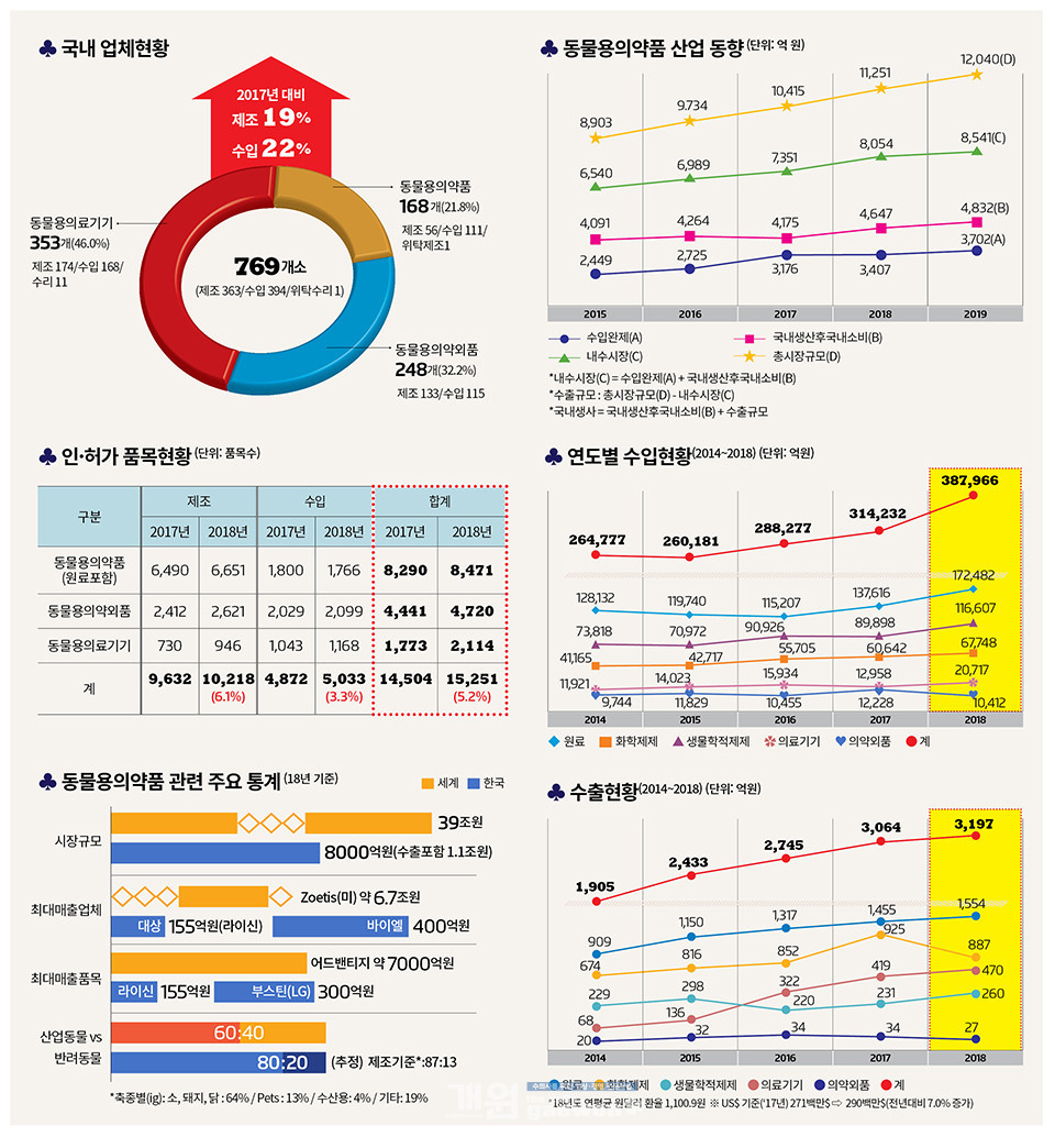 (사)한국동물약품협회(회장 곽형근)가 발표한 ‘동물용의약품 시장 분석’에 따르면, 2018년에는 전년대비 제조 19%, 수입 22% 증가한 것으로 나타났다. 업체는 총 769개소로 제조 363개소, 수입 394개소, 위탁수리 1개소이며, 이 중 동물용의료기기 353개(50%), 동물용의약품 168개(32%), 동물용의약외품 248개(18%)를 차지했다.