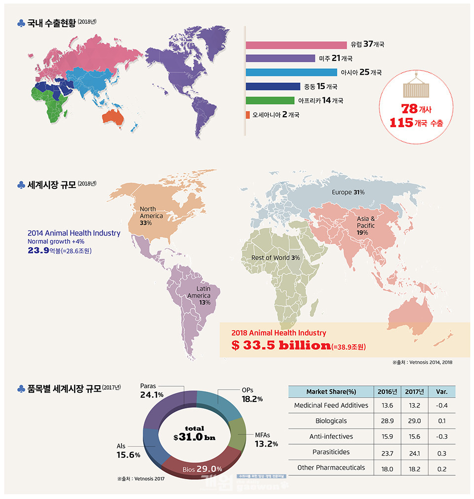 전 세계 애니멀헬스 산업규모는 2018년 38.9조원으로 북아메리카(33%)가 가장 많은 비중을 차지했으며, 뒤를 이어 유럽(31%), 아시아·태평양(19%), 라틴 아메리카(13%) 순으로 나머지 지역이 3%를 차지했다.