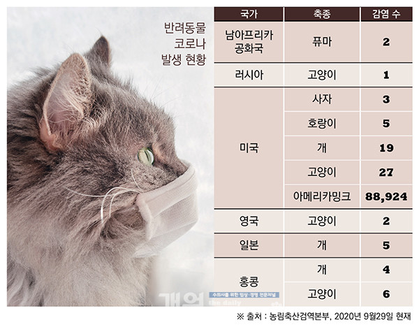 농림축산검역본부가 발표한 해외 가축전염병 발생 동향에 따르면, 감염동물은 아메리카밍크가 8만8,924마리로 압도적인 1위를 차지했으며, 다음으로 고양이와 개의 감염률이 높았다.
