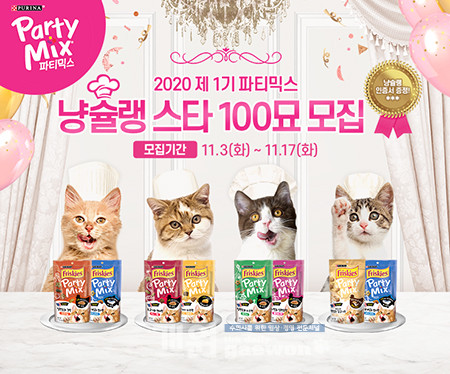 네슬레퓨리나의 고양이 영양 간식 브랜드 ‘파티믹스’가 11월 17일(화)까지 2주 동안 ‘제 1기 파티믹스 냥슐랭 스타’ 100묘를 모집한다.