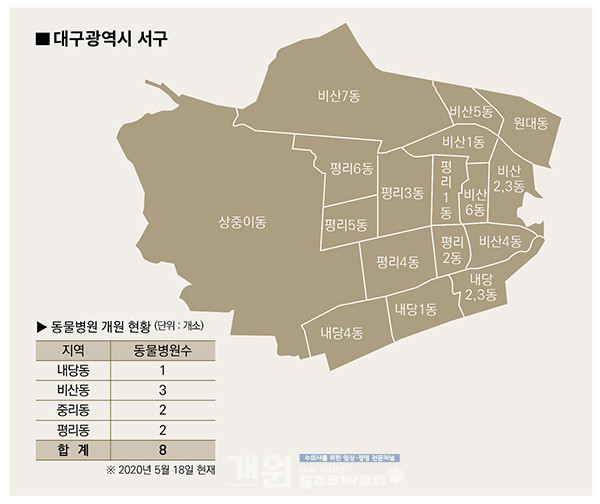 행정안전부가 발표한 대구 서구의 인구가 17만1,947명(2020년 9월 현재)임을 감안하면 21만명 당 동물병원 1개소가 개원하고 있는 것이다.