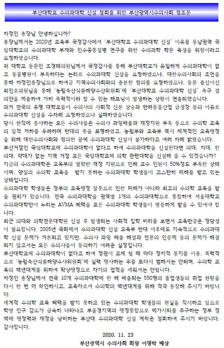 부산지부는 협조문을 통해 “차정인 총장님께서 전국 10개 수의과대학에 한 해 배출되는 550명의 졸업생들의 취업 현황을 다시 한 번 더 확인하시고, 교육자로서 수의학의 백년대계를 위해 적극 동참해 주시기 바란다”고 강조했다.