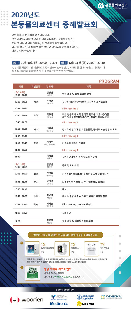본동물의료센터가 주최하는 ‘2020년도 본동물의료센터 증례발표회’가 오는 12월 10일(목)~11일(금) 웨비나로 진행된다.
