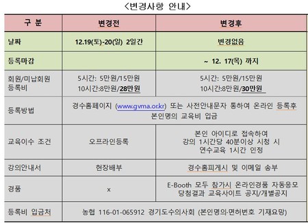 경수회 측은 "우리회는 최근 수도권 중심으로 장기화되고 있는 COVID-19 팬데믹 현상으로 12월 19~20일 개최하는 '송년‧학술대회'를 전면 온라인으로 전환해 개최키로 결정했다"며 "방역의 최일선에 있는 수의사의 자발적 참여와 정부의 권고사항을 준수 하고, 회원 및 관계자분들의 안전을 위한 조치인 만큼 회원 및 업체 관계자, 강사님들의 너그러운 양해 및 협조를 부탁드린다"고 밝혔다.