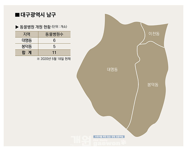 2020년 5월 18일 현재 대구 남구의 동물병원은 11개소에 그친다. 현재 개발 중인 아파트 단지가 많은 만큼 추가 개원 여력은 충분해 보인다.