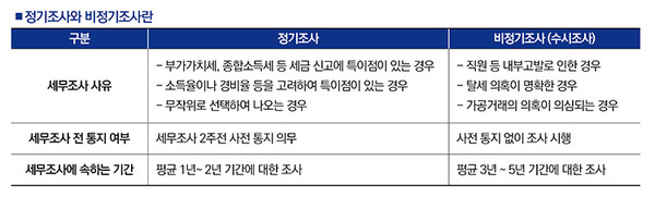이와 반대로 ‘비정기조사’는 수시조사라고도 하며, 내부고발, 탈세 의혹이 보이는 경우 수시적으로 발생하는 조사이다.