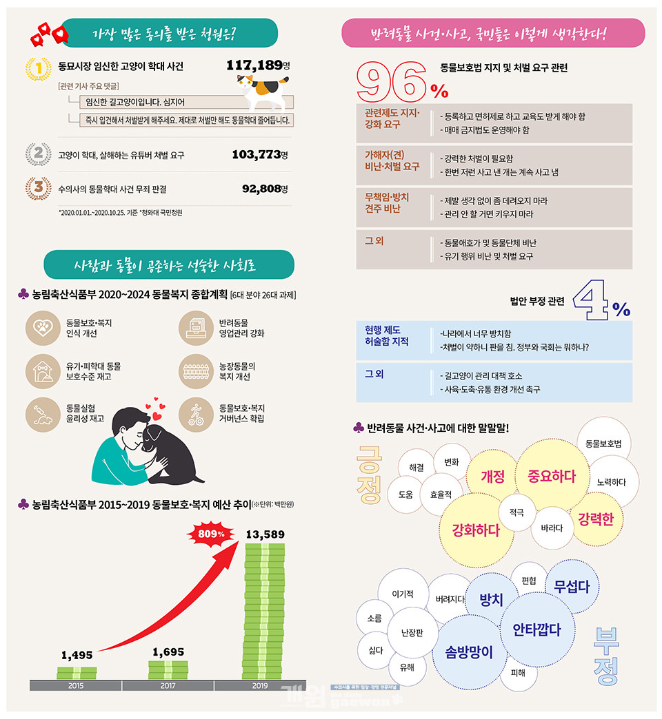 농림수산식품교육문화정보원이 최근 3년간 반려동물 사건·사고 온라인 동향을 분석한 결과, 청와대 국민청원에서 10만이 넘는 동의를 얻을 만큼 ‘동물학대’에 대한 시민들의 관심이 높은 것으로 나타났다.