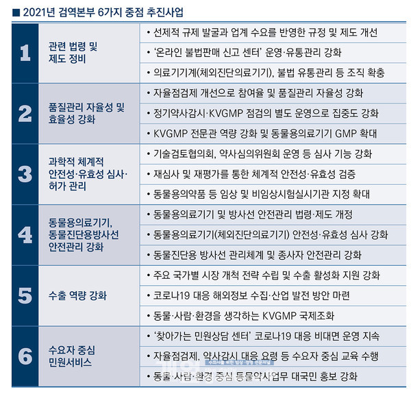 검역본부는 2021년 신년 계획을 통해 관련 법령 정비 및 동물용 의료기기 안전관리 강화 등 6가지의 사업 추진 계획을 밝혔다.