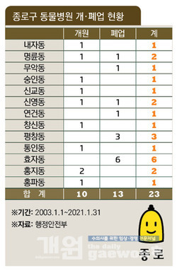 특히 종로구의 인기 개원지인 평창동과 효자동에 동물병원이 사라졌다. 반면 지난 해 3년만에 개원한 동물병원이 등장하면서 다시 종로구에 대한 관심을 보이고 있다.