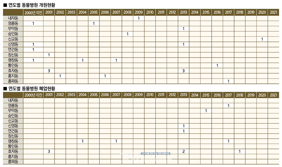 종로를 대표하는 고급 주택가인 평창동과 효자동은 동물병원이 단 한 곳도 개원하고 있지 않다. 무악동과 연건동도 2016년 이전에 폐업한 이후로 단 한 곳도 없는 지역이 됐다.