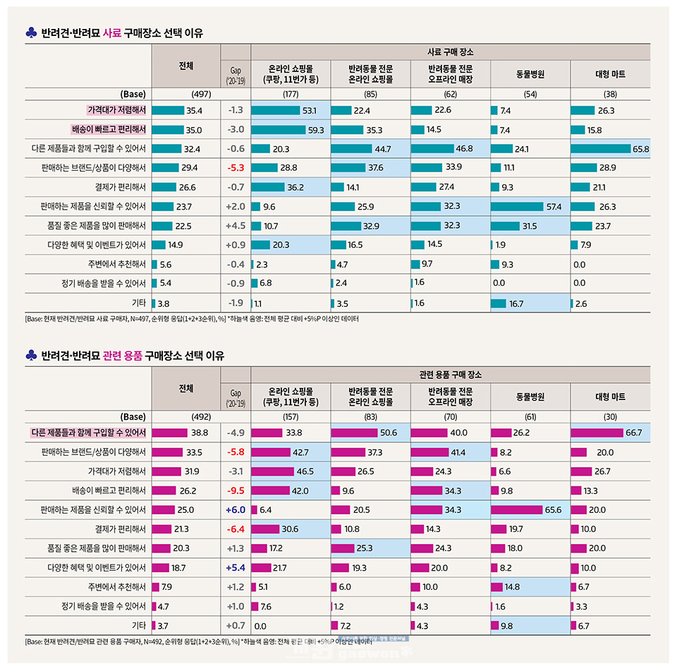 이처럼 전문 오프라인 매장과 대형마트는 ‘다른 제품과 함께 구입’할 수 있어서, 전문 온라인 쇼핑몰은 ‘상품이 다양해서’, 동물병원은 ‘판매하는 제품을 신뢰’할 수 있어서 이용하는 것으로 나타났다. <편집자주>