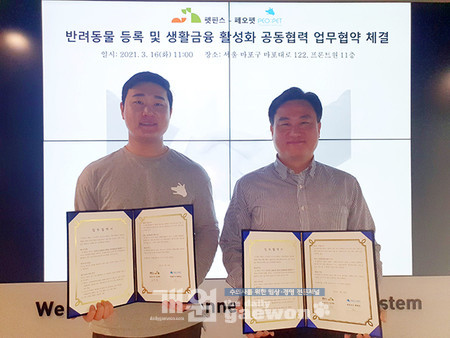 반려동물 생활금융서비스 플랫폼 운영사 (주)펫핀스(대표 심준원)와 ㈜코스모스이펙트(대표 최현일)가 동물등록의 저변 확대와 반려동물보험 및 생활금융 활성화를 위한 상호협력 목적의 업무협약을 지난 3월 16일 핀테크큐브 세미나실에서 체결했다.