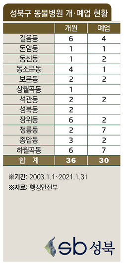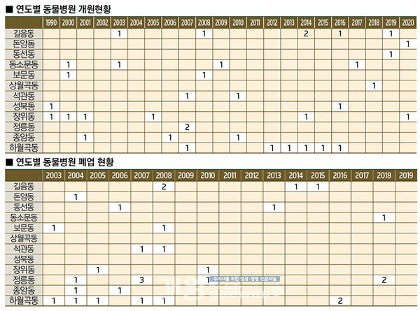 반면 정릉동, 종암동, 보문동은 10년째 동물병원 개원이 이뤄지지 않고 있다. 그 중에서도 정릉동은 폐업만 꾸준히 늘면서 2개소의 동물만 개원하고 있다.