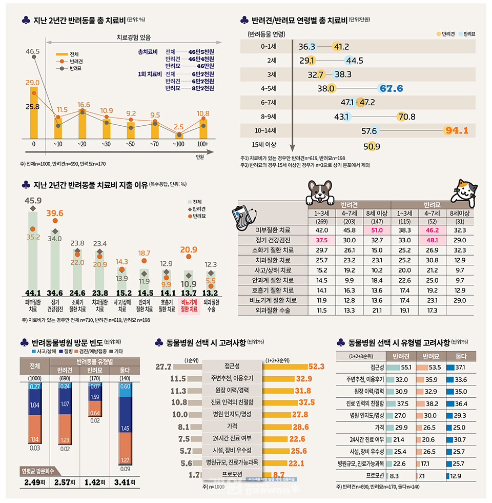 KB금융지주 경영연구소가 발표한 ‘2021 한국 반려동물 보고서’에 따르면, 지난 2년간 반려동물 치료비를 지출한 반려가구는 71.0%로 2/3 이상의 가구가 치료비를 지출, 총 치료비는 평균 46만5천원으로 반려견은 1회 평균 6만7천원을, 반려묘는 1회 8만7천원을 지불한 것으로 나타났다.