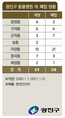 90년대까지 12개소의 동물병원이 개원하고 있었던 광진구는 2021년 1월 31일 현재 3배가 넘는 38개소로 증가했다.