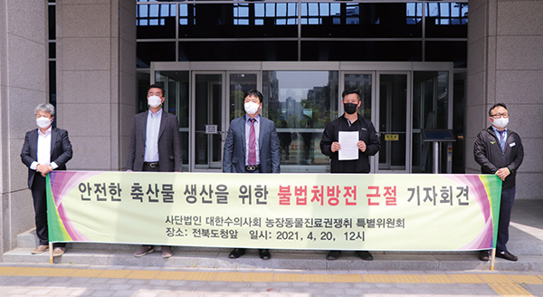 대한수의사회(회장 허주형, 이하 대수회)의 농장동물진료권쟁취특별위원회(위원장 최종영, 이하 특위)가 지난 4월 20일 전북도청 앞에서 성명서를 발표하고, 안전한 축산물 생산을 위한 불법 처방전 근절을 선언했다.